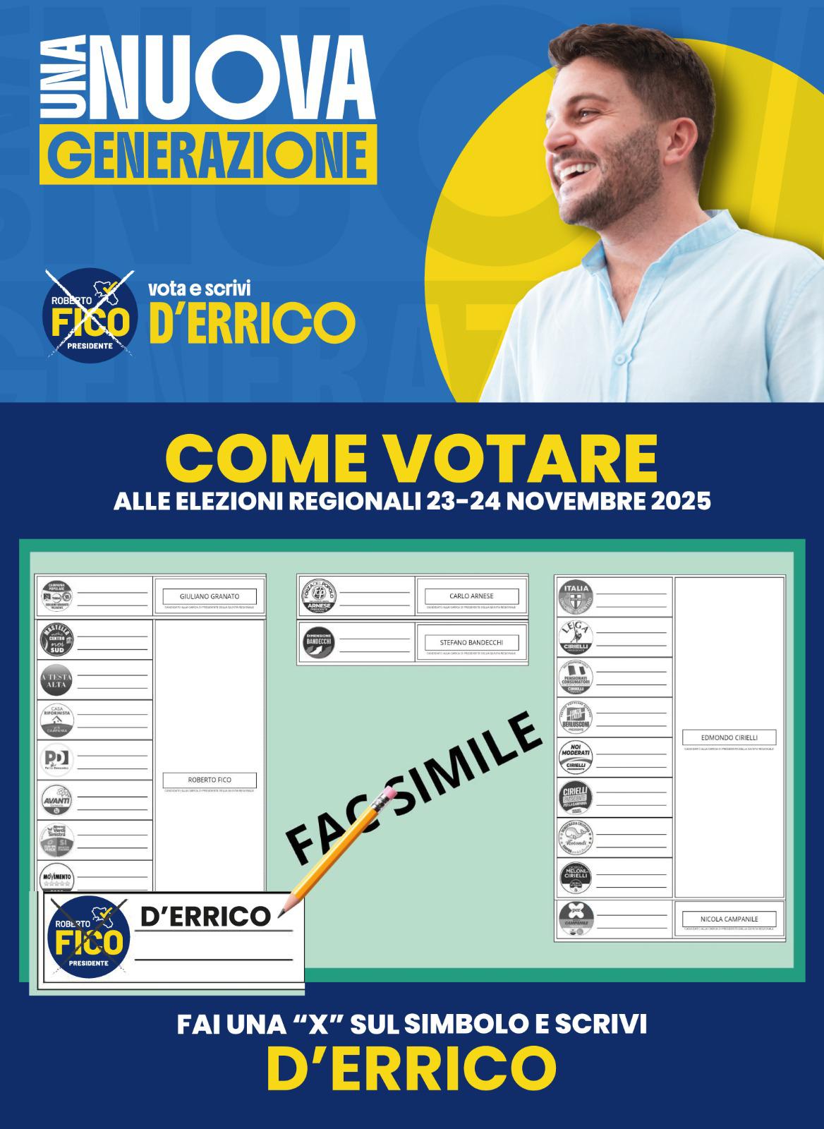 Si può votare per Davide D’Errico in tutti i 92 Comuni della provincia di Napoli. Basta fare una “X” sul simbolo “Fico Presidente” e scrivere affianco “D’Errico”, proprio come nel FAC-SIMILE che vedi qui.